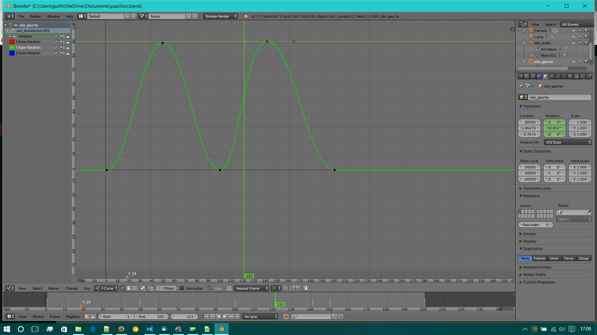 - GraphEditor : La courbe représente l’évolution du degré de rotation en fonction des frames